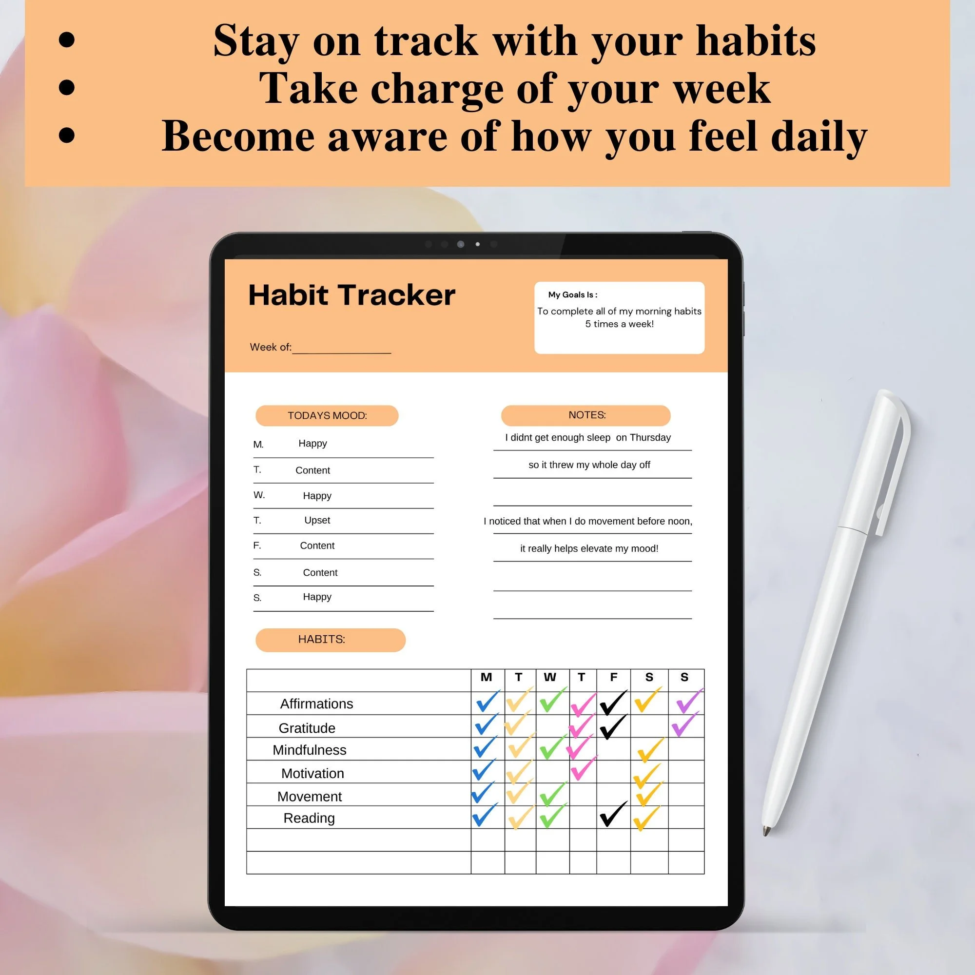 Daily Domination: Track Your Triumphs! Each day has a checkbox for each habit. Seeing those little checks add up is a powerful motivator, keeping you on track for a happier week!